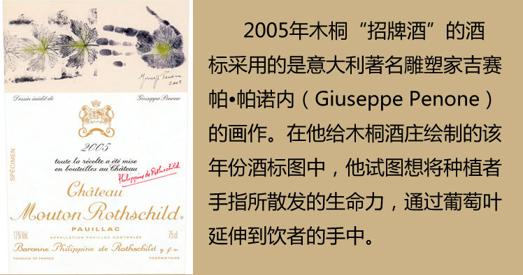 2005年木桐酒標采用的是著名雕塑家吉賽帕·帕諾內(Giuseppe Penone)的畫作。這位意大利的藝術家1947年降生在著名酒鄉皮爾蒙特省的Garessio小城。年輕時,帕諾內曾求學于都靈,在此期間,他成為了意大利“貧困藝術”運動的領導者之一。2004年,帕諾內在巴黎的蓬皮杜中心舉辦了他的個人作品回顧展。在帕諾內的藝術生涯中,他一直在尋求植物世界與人體的聯系,他認為這個聯系將會揭示出兩者之間物質的實質性。在他給木桐酒莊繪制的2005年份酒標圖中,他試圖想將種植者手指所散發的生命力,通過葡萄葉延伸到飲者的手中。