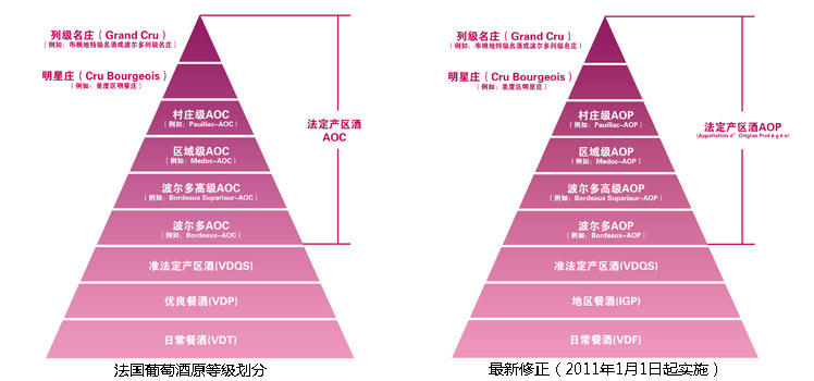 2009年08月的時候,為了配合歐洲葡萄酒的級別標注形式,法國葡萄酒的級別發生了一次改革。以下是新的等級制度,將在2011年1月1日起裝瓶生產的產品使用新的等級標記: