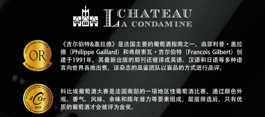 榮獲吉爾伯特&蓋拉德 指南金獎(jiǎng)、2019年科比埃葡萄酒大賽金獎(jiǎng)